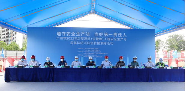 为扎实做好“龙舟水”期间在建工地的防汛防御工作,强化现场应急处置能力,市住房城乡建设局近日在番禺区广州国际创新城一期C居住地块项目和中国铁建华南总部大厦项目,组织开展了2022年全市房屋建筑工地防汛应急演练活动。(防汛应急演练现场) 今年6月是第21个全国“安全生产月”,本次演练活动紧扣安全生产月“遵守安全生产法,当好第一责任人”的主题,实战演练了龙舟水期间突降暴雨,雨水大量倒灌进入基坑,造成
