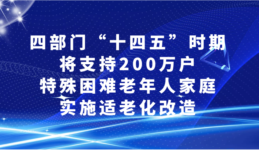 为贯彻落实《国民经济和社会发展第十四个五年规划和2035年远景目标纲要》和《“十四五”国家老龄事业发展和养老服务体系规划》部署要求,近日,民政部、财政部、住房和城乡建设部和中国残联4部门联合印发《关于推进“十四五”特殊困难老年人家庭适老化改造工作的通知》(以下简称《通知》),提出“十四五”时期支持200万户特殊困难高龄、失能、残疾老年人家庭实施适老化改造,巩固家庭养老基础地位,进一步提升老年人居家生活的安全性和便利化。