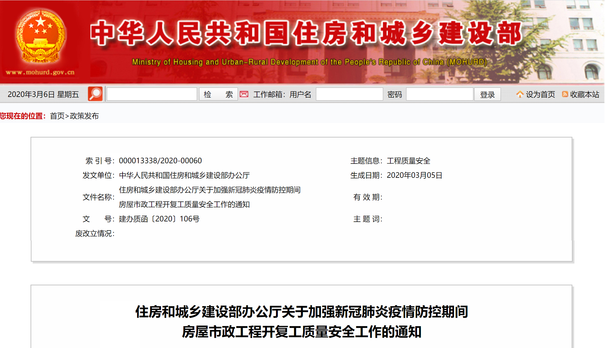 当前,各地房屋市政工程(以下简称工程)逐渐进入全面恢复施工阶段,新冠肺炎疫情防控和工程开复工质量安全压力交织叠加。各地要认真贯彻落实习近平总书记关于统筹推进疫情防控和经济社会发展的重要指示精神,精准做好疫情防控和质量安全监管工作,有序推动工程开复工,保障工程质量安全。现就有关事项通知如下: (一)强化政治意识。各地要进一步增强“四个意识”、坚定“四个自信”、做到“两个维护”,自觉把思想